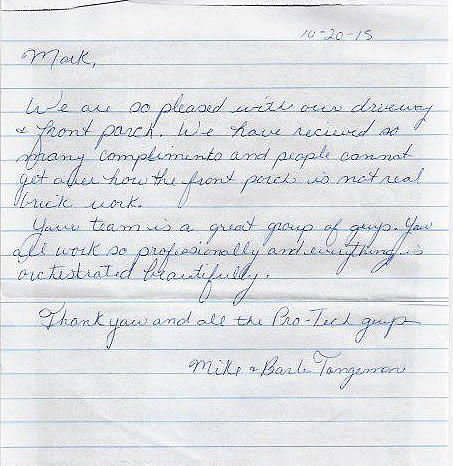 HE WAS VERY NICE AND HIS CREW WAS VERY GOOD. IT TOOK TWO DAYS, ONE FOR THE DRIVEWAY AND THEN THE SECOND DAY FOR THE APRON AND GUTTER (CURB). THEY ARRIVED EARLY AND WORKED MOST OF THE DAY IN REALLY HOT WEATHER. IT WAS 85 DEGREES AND HIGHER BOTH DAYS BUT THEY STILL STAYED MOST OF THE DAY. HE GOT ALL OF THE PERMITS THAT WERE NEEDED, AND ALL THE REQUIREMENT THAT THE CITY NEEDED WERE MET. THE FACT THAT HE LIVED IN THE NEIGHBORHOOD AND THE PRICE WAS GOOD WAS WHY I WENT WITH PRO-TECH. IF YOU WANT A GOOD JOB DONE FOR A GOOD PRICE THEN YOU NEED TO CALL MARK AT PRO-TECH CUSTOM CONCRETE.